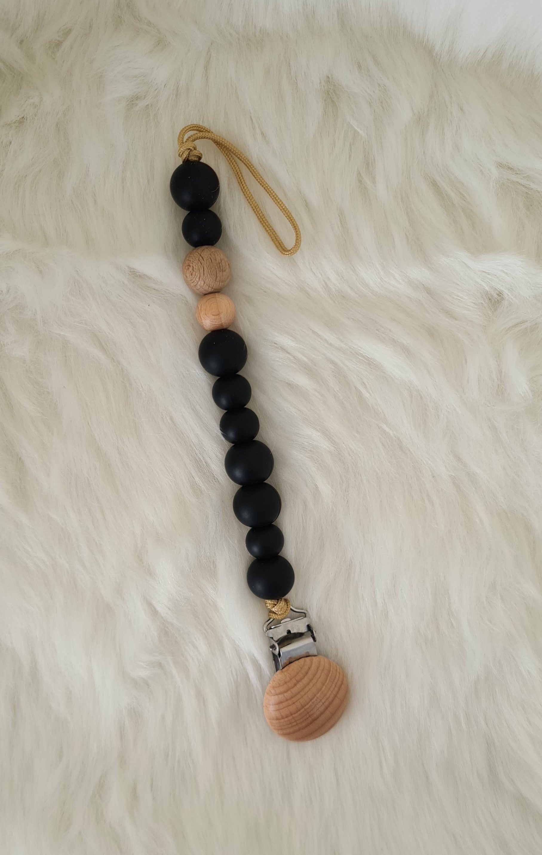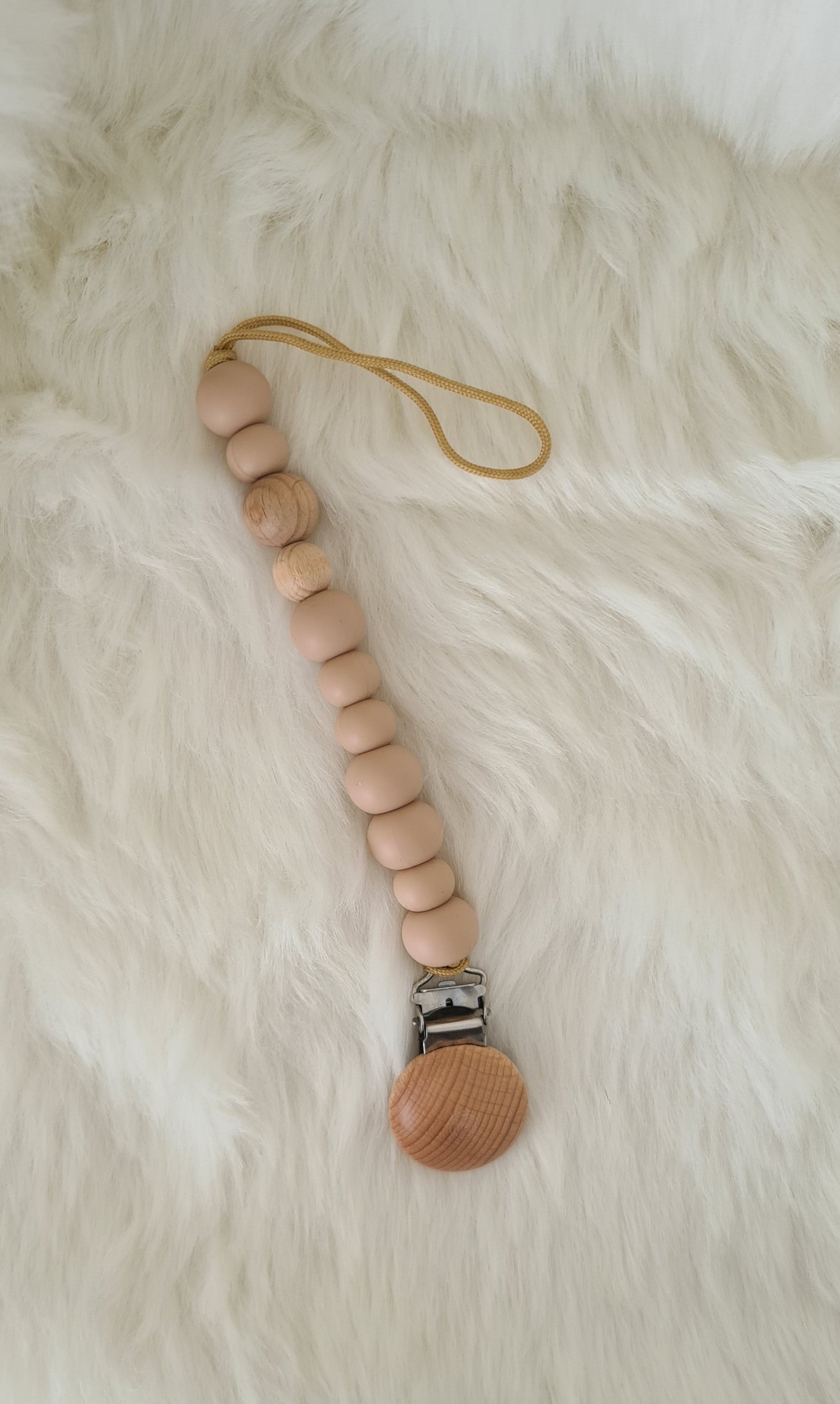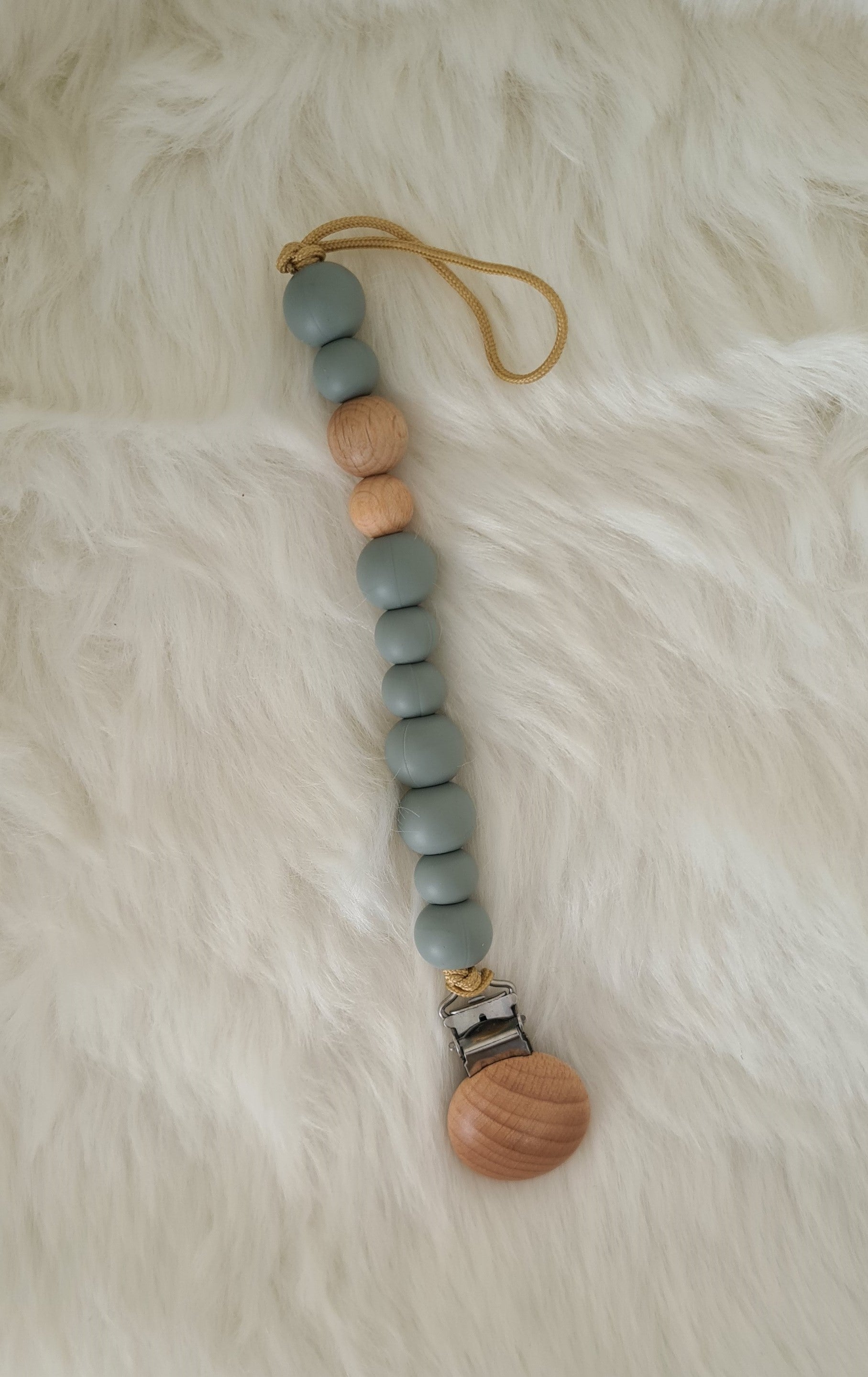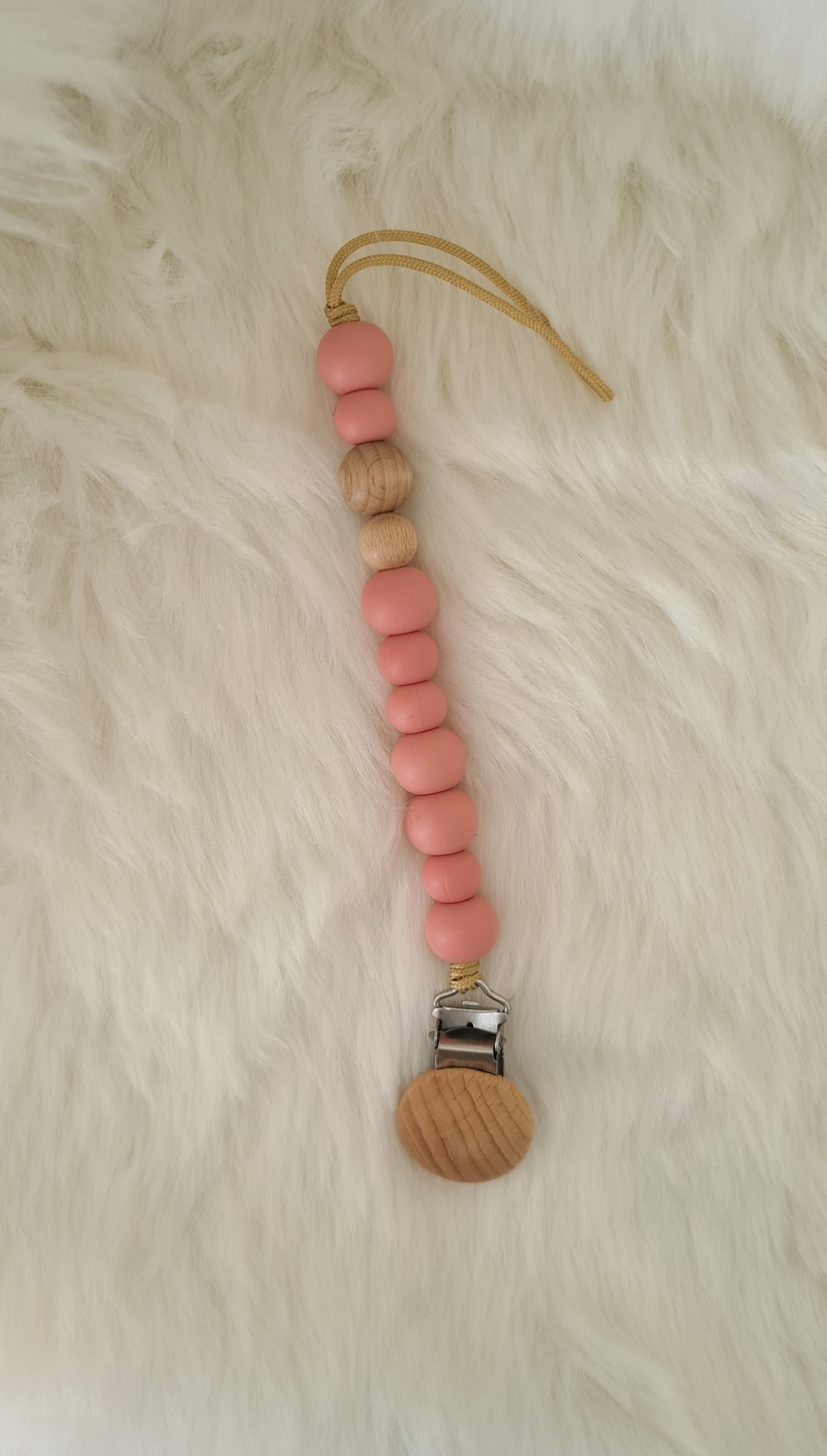 Chaîne en silicone et perles en bois pour la tétine du bébé et c'est aussi un anneau de dentition idéal lorsque les dents commencent à apparaître.