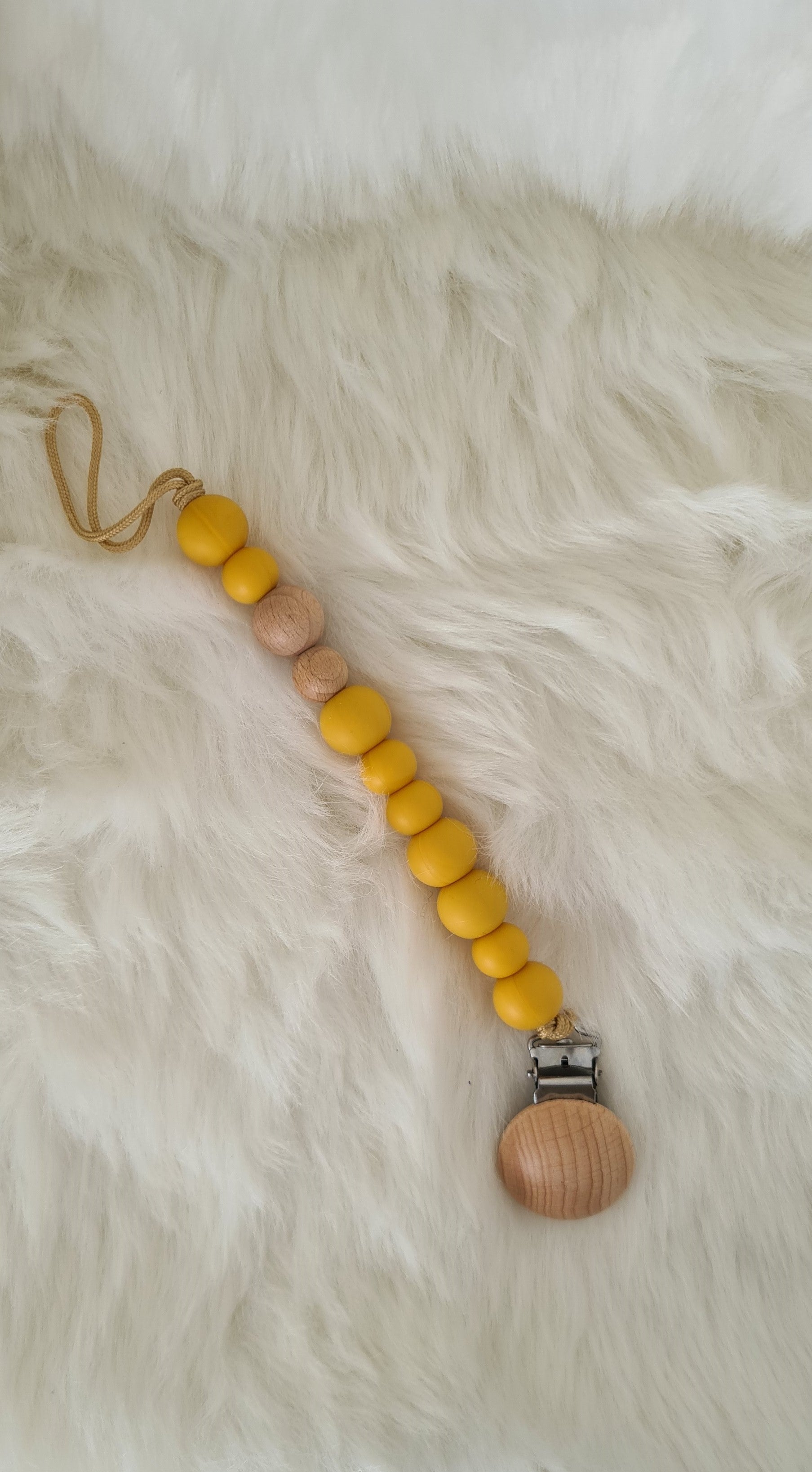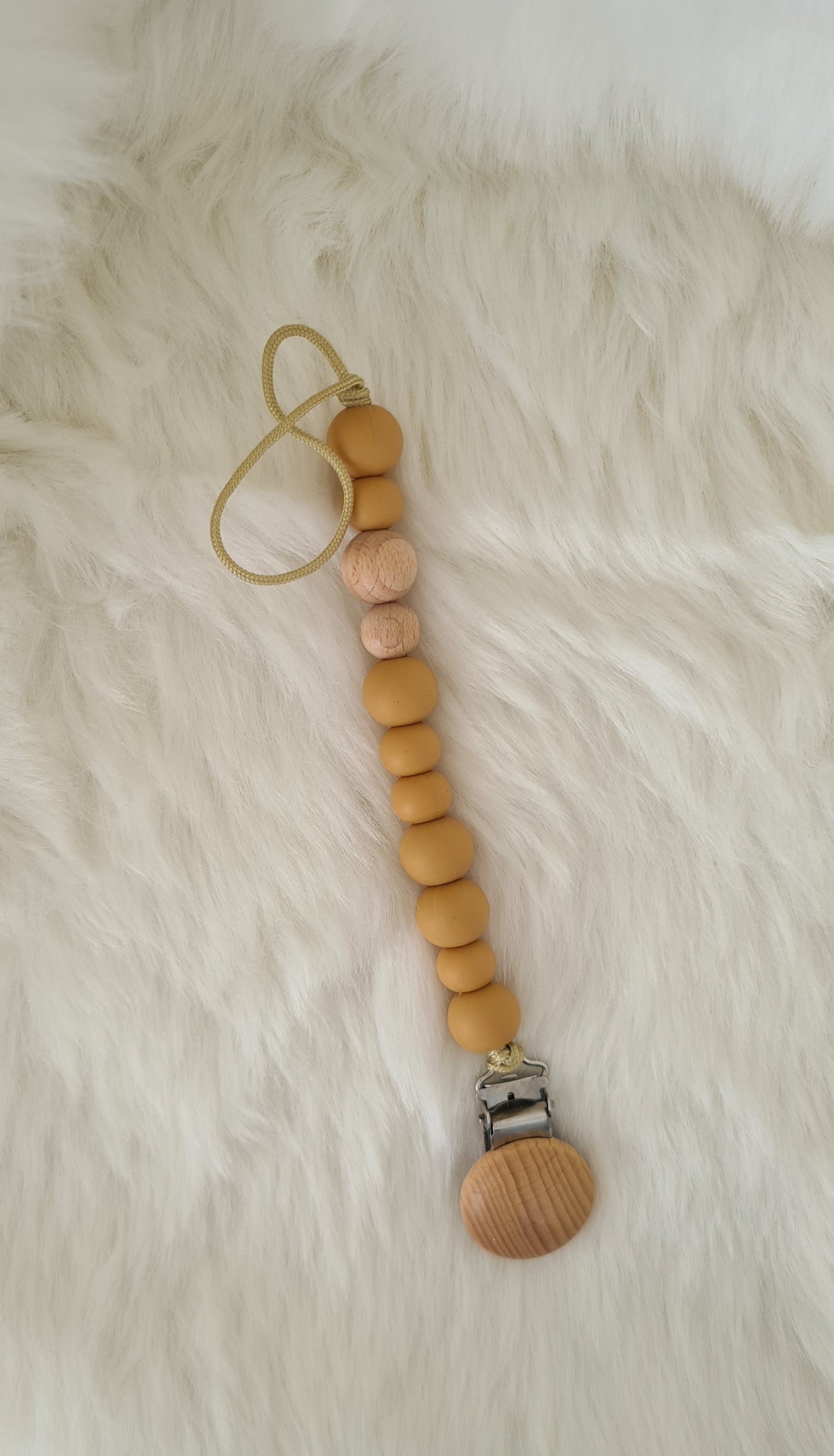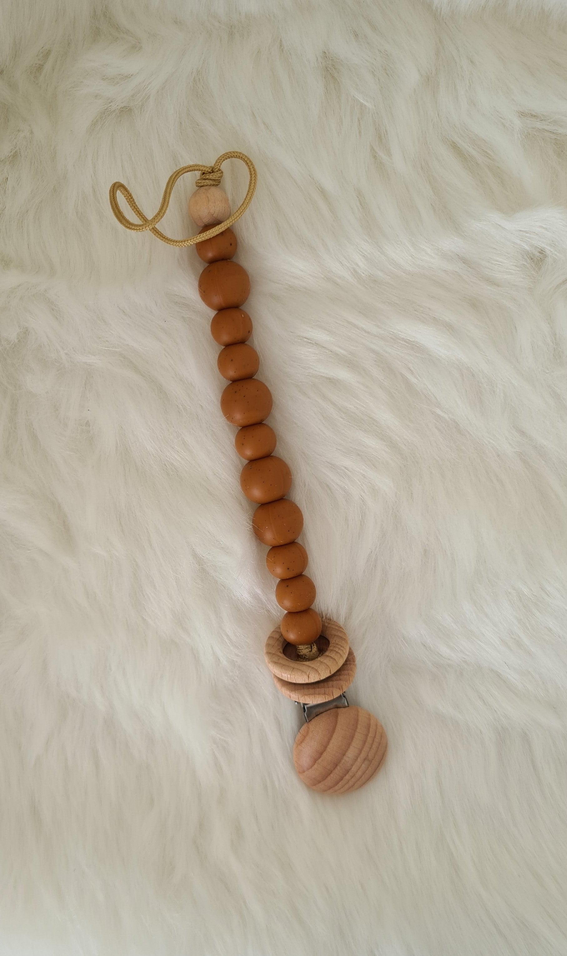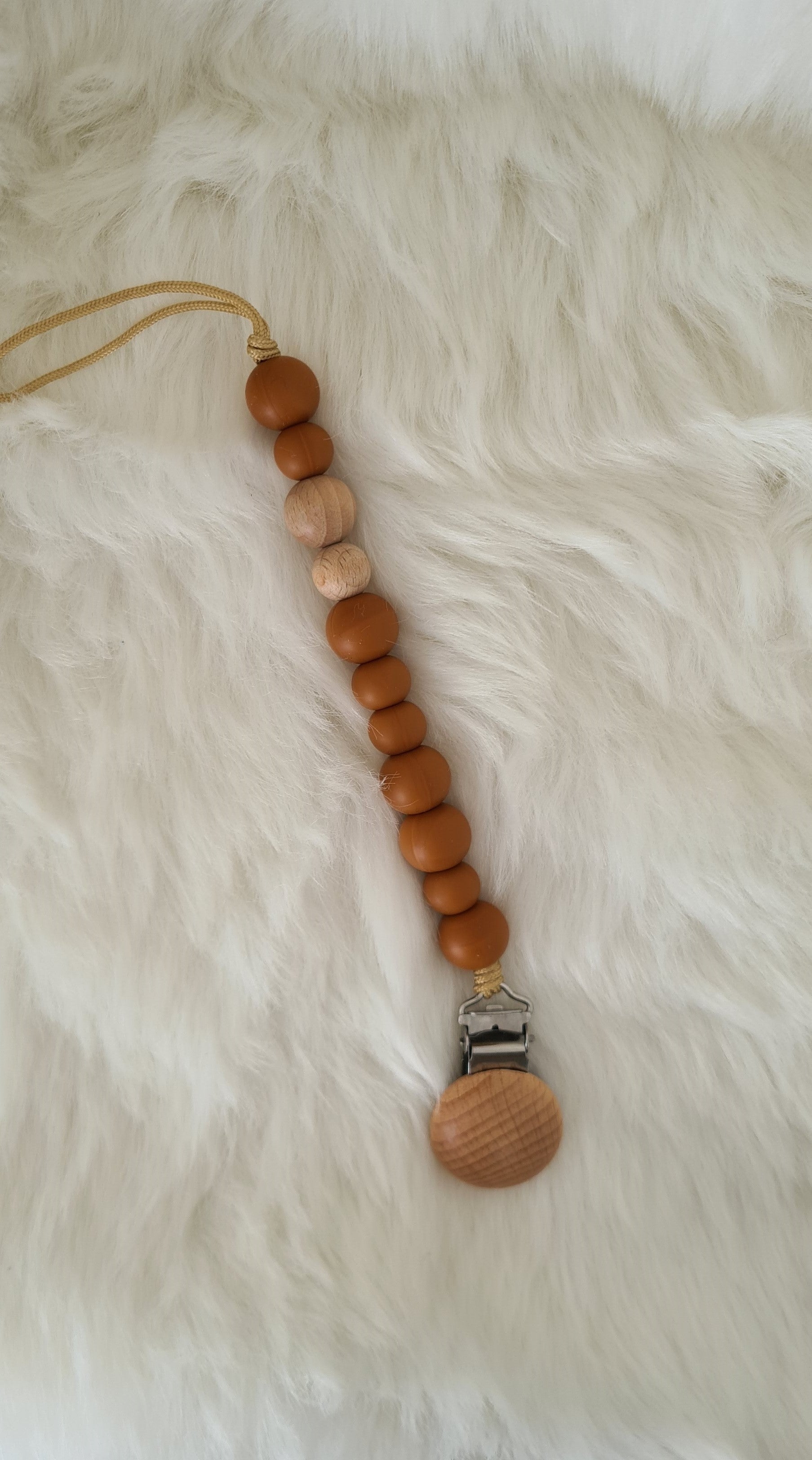 Chaîne en silicone et perles en bois pour la tétine du bébé et c'est aussi un anneau de dentition idéal lorsque les dents commencent à apparaître.