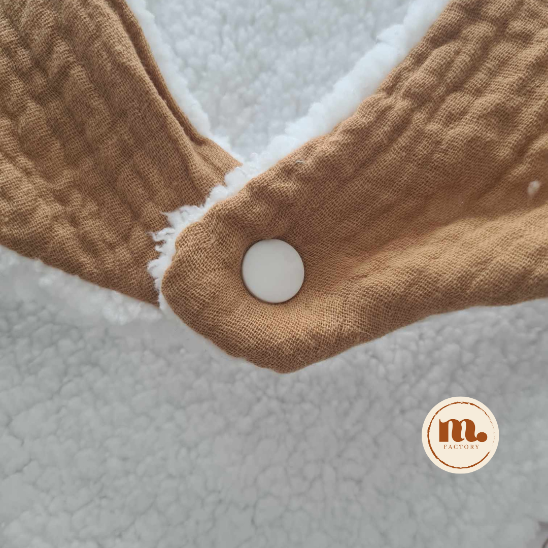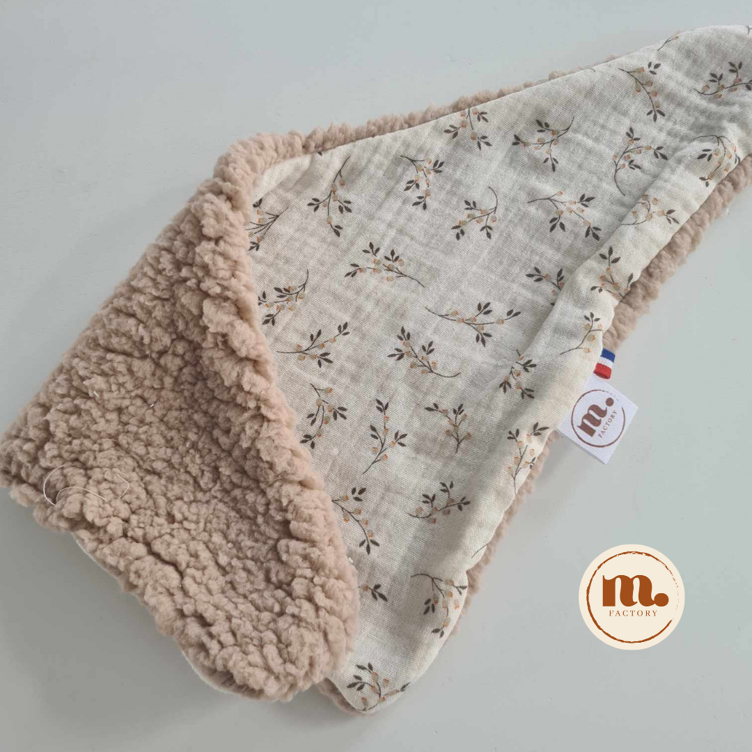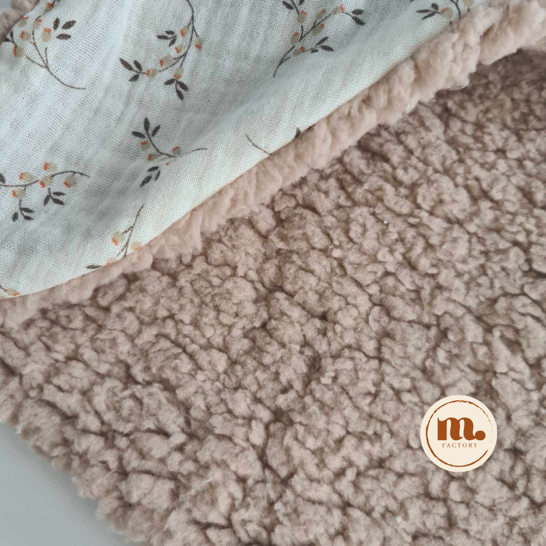 Composé à 100% de gaze de coton et sherpa certifiés oeko-tex.
