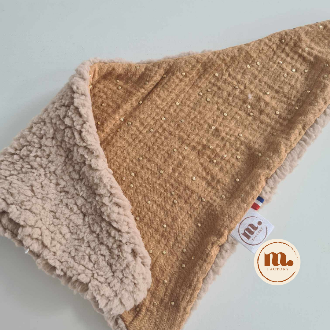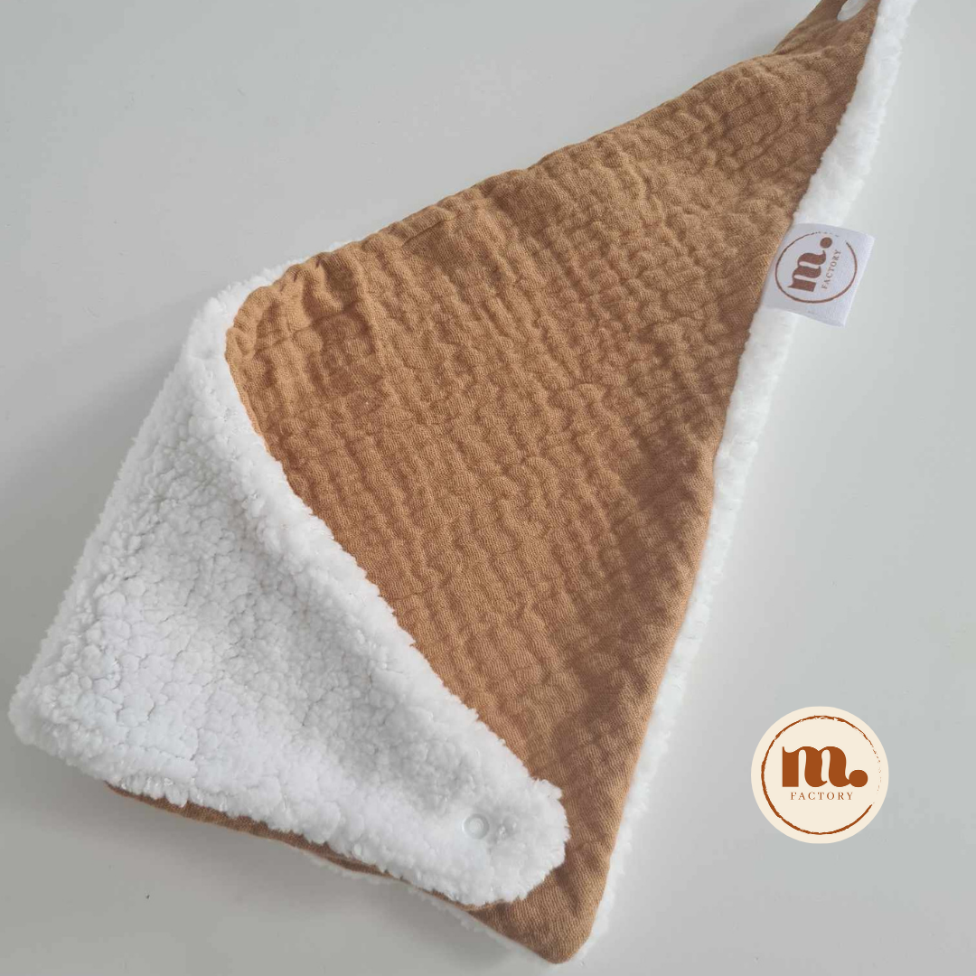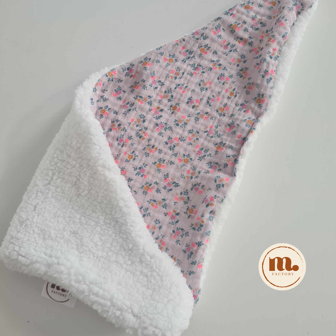 Composé à 100% de gaze de coton et sherpa certifiés oeko-tex.